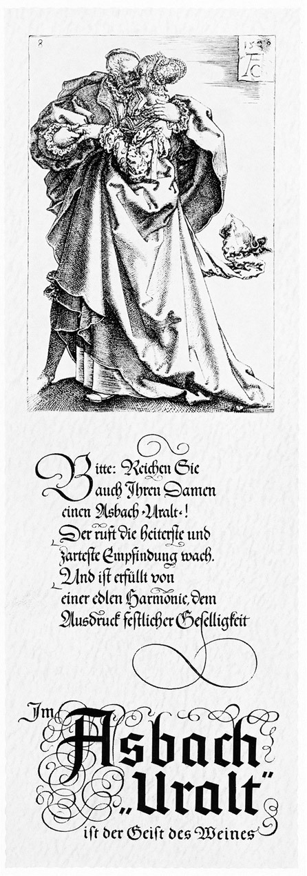 «Свадебные танцоры». Рекламный слоган Asbach в сочетании с гравировкой Албрехта Дюрера. Рекламная листовка.